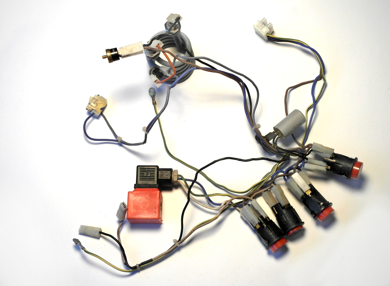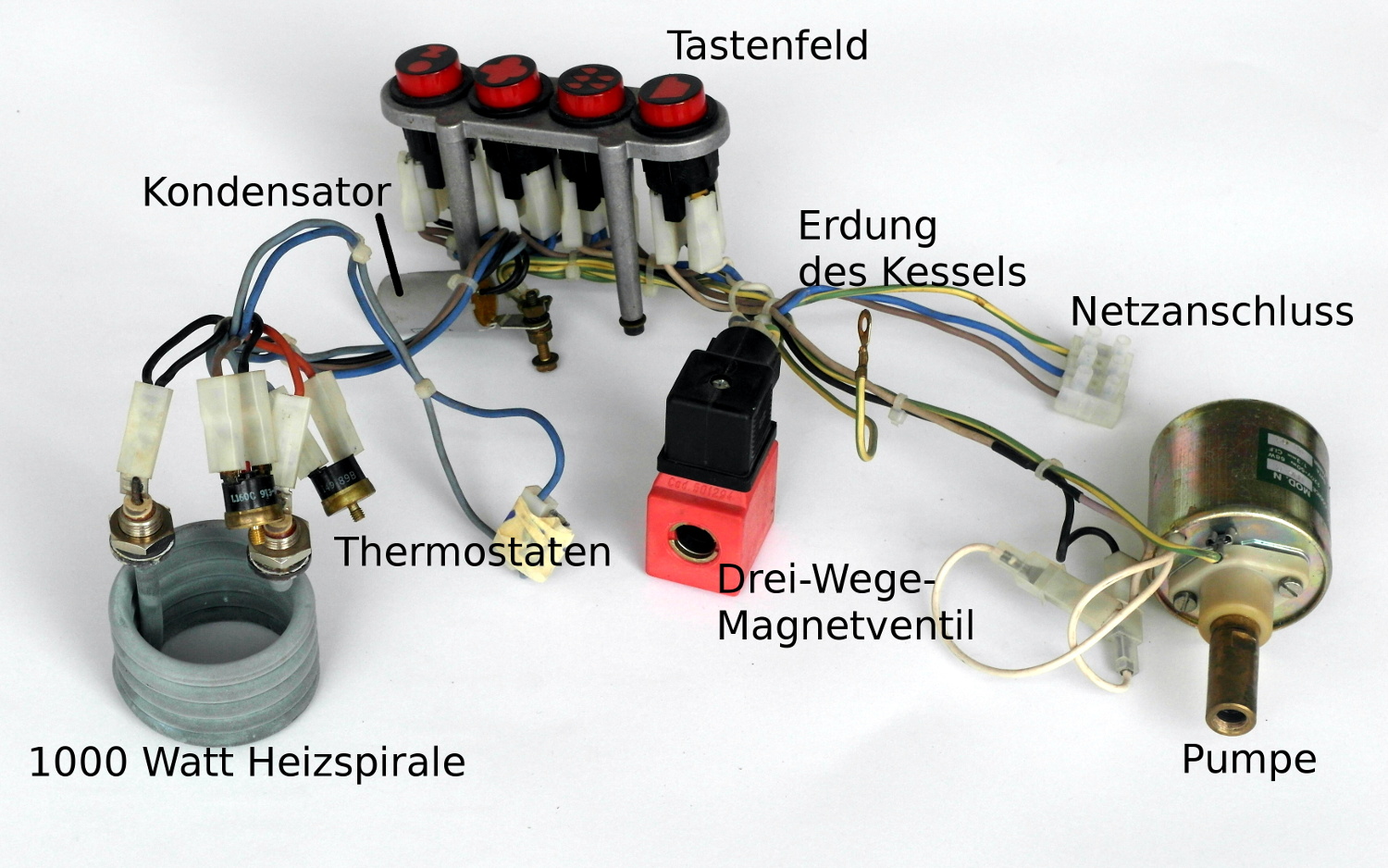 Auf den ersten Blick erkennt man immerhin schon klar links den massiven zweiteiligen Kessel (oben Messing, unten Chromstahl), unten die an Gummilaschen federnd aufgehängte Wasserpumpe und rechts oben das Tastenfeld. Der Rest ist fürs ungeübte Auge allgemeines Gewusel. Um hier etwas mehr Struktur erkennbar zu machen, habe ich einmal die zusammengehörigen Teile des Stromkreislaufes und des Wasserkreislaufes separat für sich fotografiert. Alle Bilder können übrigens angeklickt und damit vergrößert werden.