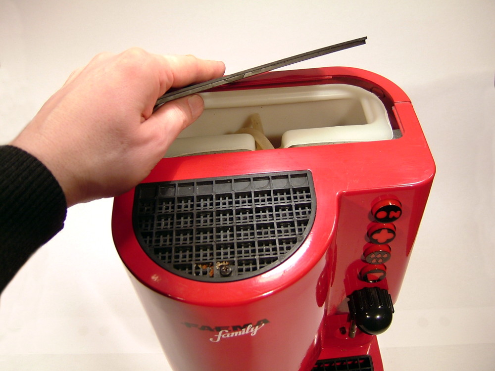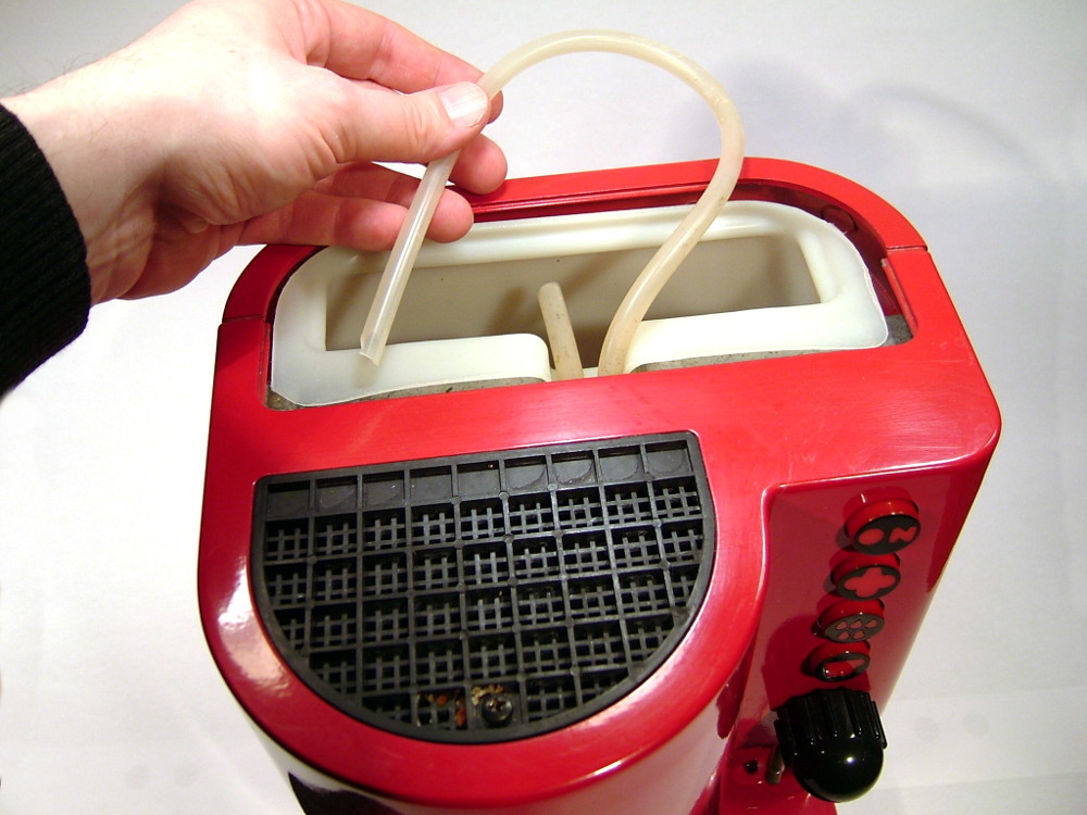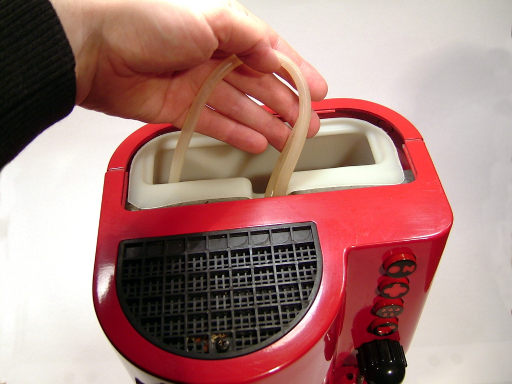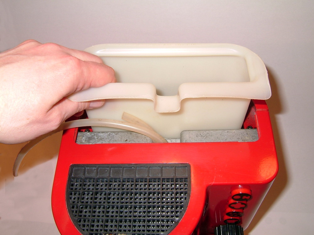 Wenn man die Schläuche beiseite hält, kann man den Plastikbehälter des Wassertanks herausheben. Die Wulst am oberen Ende auf der Rückwand des Behälters hilft beim anfänglichen Anheben, da finden die Finger Halt. Sobald man den ersten Zentimeter Aufwärtsbewegung geschafft hat (wenn noch viel Wasser im Tank ist, kann das durchaus etwas mühsam sein), kann man mit der anderen Hand sehr gut unter den vorderen „Kragen“ des Behälters fassen. Der Tank wird entleert und beiseite gelegt. Nicht vergessen, ihn gut zu reinigen!