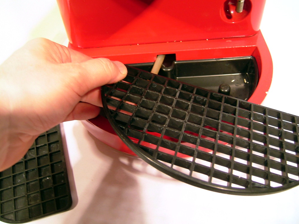 Nun wird das halbkreisförmig, schwarze Gitter über dem „Sumpf“ entfernt. „Sumpf“ nenne ich die Auffangschale unter dem Filterträger. Die Namensgebung ist selbsterklärend, denn wenn man sich nicht sehr hingebungsvoll und vor allem häufig der Reinigung dieser Schale widmet, bildet sich da unten ein erstklassiger Schlamm aus Kaffee- und Milchresten.
