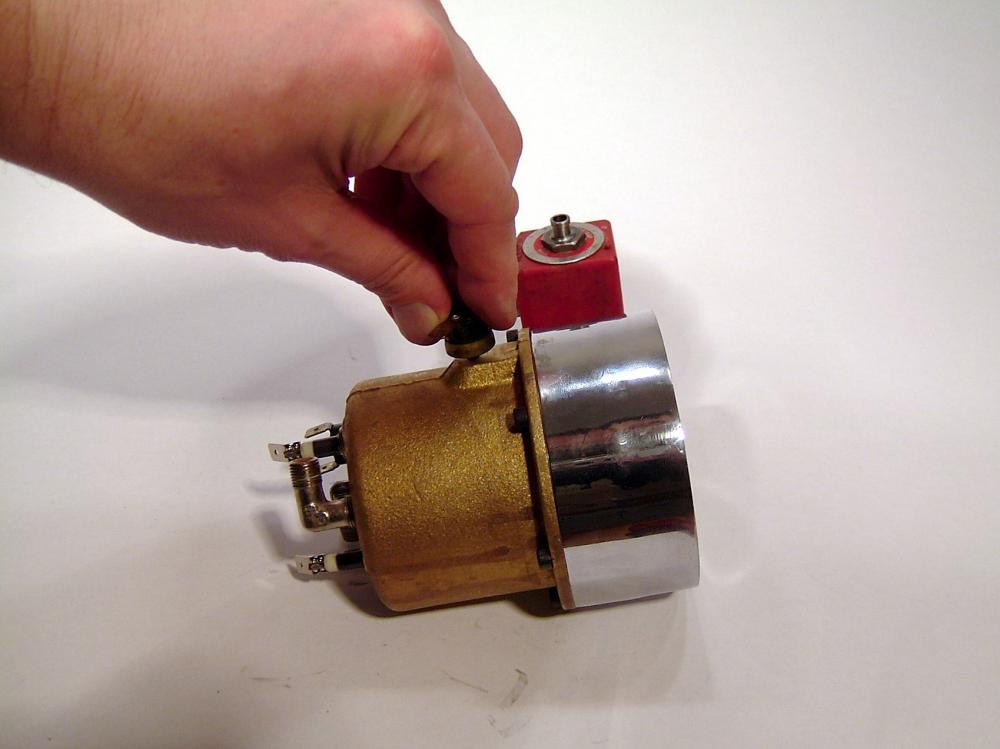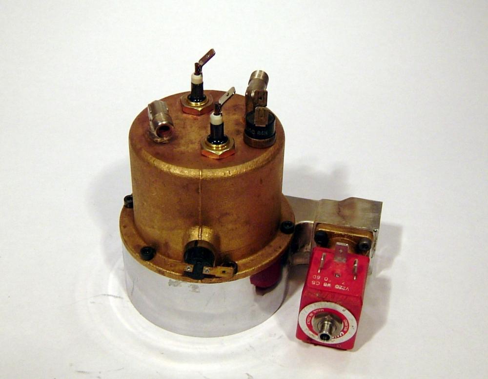 So sieht der kompakte Kesselblock aus, wenn man ihn erfolgreich von der Gerätetafel abmontiert und alle Rohrleitungen und Kabel entfernt hat. Mittig vorn erkennt man den Thermostat, der die Brühtemperatur für den Espresso kontrollieren soll. Obenauf hingegen der Thermostat, der die Temperatur für die Dampferzeugung regelt. Da die erstere Temperatur niedriger als die letztere sein muss und die Maximalwerte jeweils außen auf den Thermostaten aufgedruckt sind, kann man sie leicht auseinander halten.