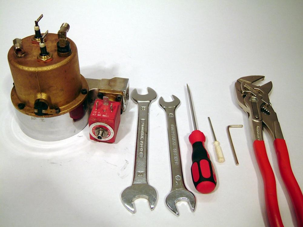 Dies ist das gesamte Werkzeug, was man für die Demontage des Kesselblocks benötigt: Zwei Maulschlüssel der Größen 17/16 sowie 15/14, ein schmaler und ein sehr kleiner Schlitzschraubenzieher, ein Imbus-Schlüssel der Größe 3 mm sowie eine Rohrzange (es muss keine Knipex wie hier im Bild sein).