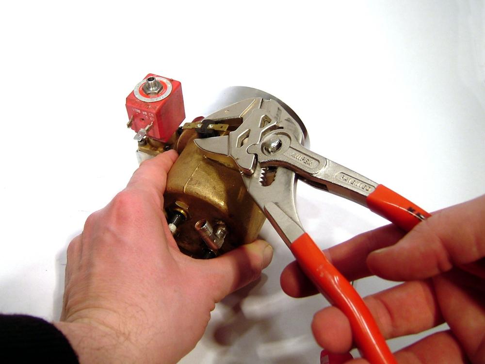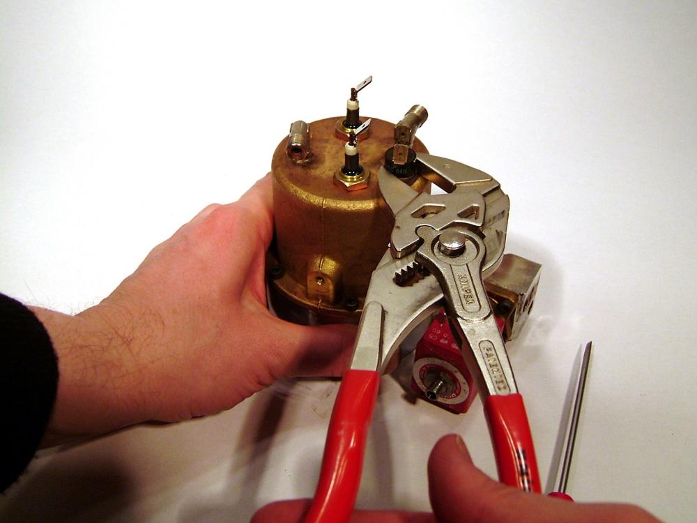 Die Zange braucht man nämlich nur ganze zwei Mal - jeweils um die Thermostaten behutsam in ihrer Verschraubung zu lösen. Ein bisschen Feingefühl schadet dabei nicht, gerade soviel Gewalt wie nötig, um das durch unzählige Erhitzungsvorgänge höchst wahrscheinlich festgebackene Gewinde zu lösen, sollte man ansetzen. Packt man zu brutal zu, zerquetscht man den Thermostaten oder zumindest dessen untere Messingfassung.