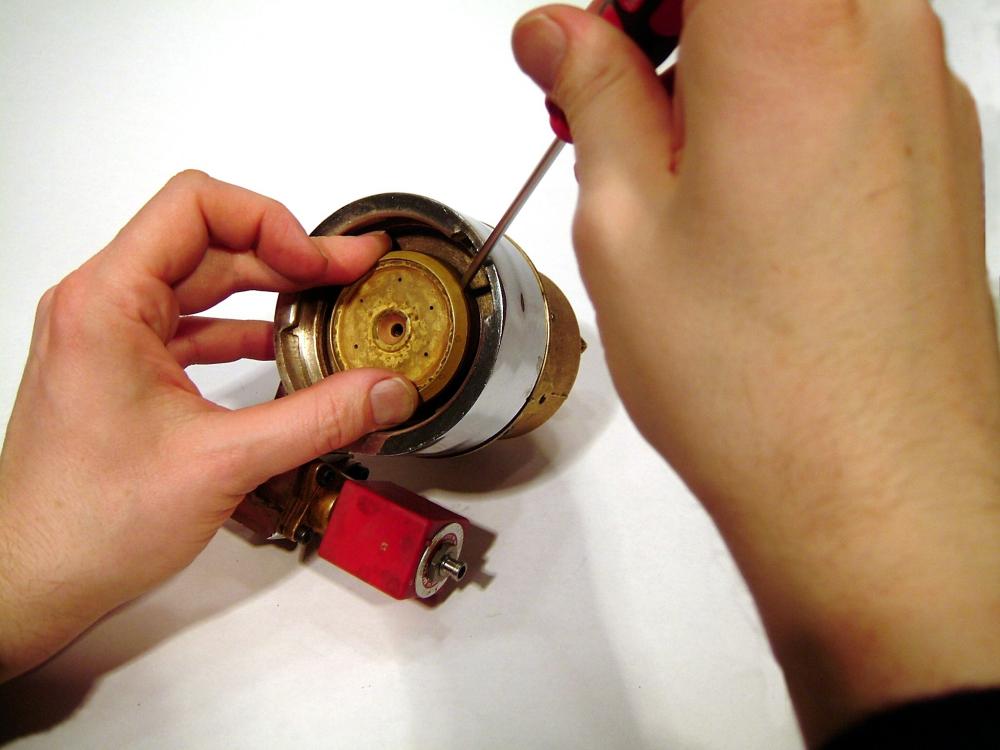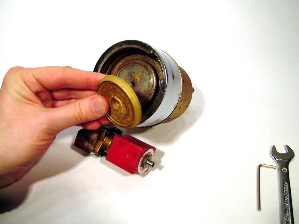 Nun ist die schwere Messingscheibe dran, die nach der Abnahme des darüber liegenden Edelstahlsiebs frei liegt. Man hilft auch hier vorsichtig hebelnd mit dem Schraubenzieher nach. Man kann hier übrigens die sechs feinen Durchlasslöcher für das Brühwasser gut erkennen (mein Daumen verdeckt das sechste Loch). Die Scheibe dient nämlich als Boden einer winzigen Verteilerkammer, in die das Brühwasser von oben durch einen Einlass eintritt, sich gleichmäßig verteilt und durch die sechs Löcher nach unten verlässt. (Die Löcher daher gründlich auf freien Durchfluss prüfen und gegebenfalls reinigen.)