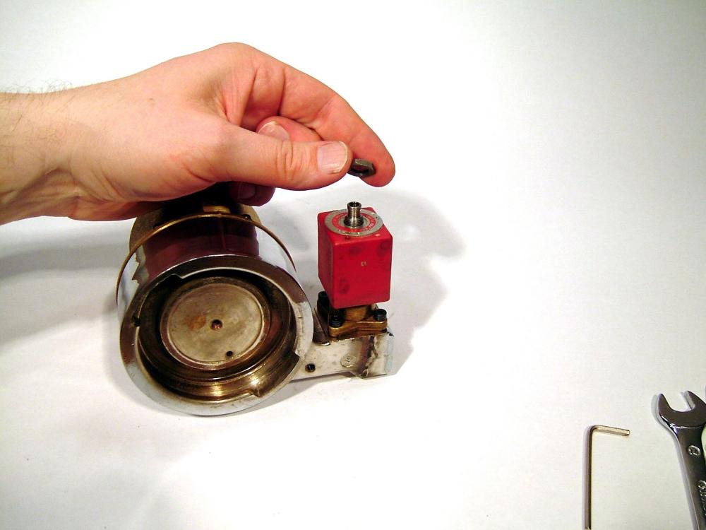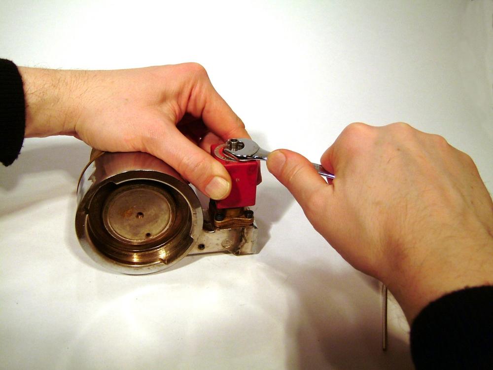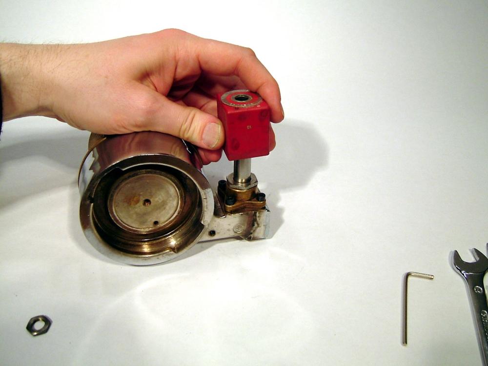 Der Block wird nun auf die Seite gelegt, denn jetzt geht es beim roten Dreiwege-Ventil weiter. Der rote Plastikwürfel enthält die Magnetspule, dieser Teil soll zuerst demontiert werden. Der Plastikwürfel wird nur von einer flachen Sechskantmutter gehalten, diese löst man mit dem 15-er Maulschlüssel. (In anderen Versionen der Faema Family steckt die Magnetspule in einem schwarzen Würfel, was aber keinen weiteren Unterschied macht.)