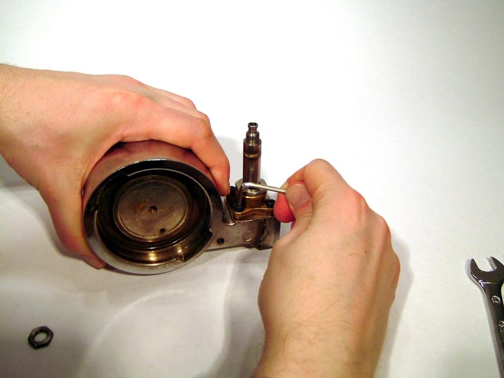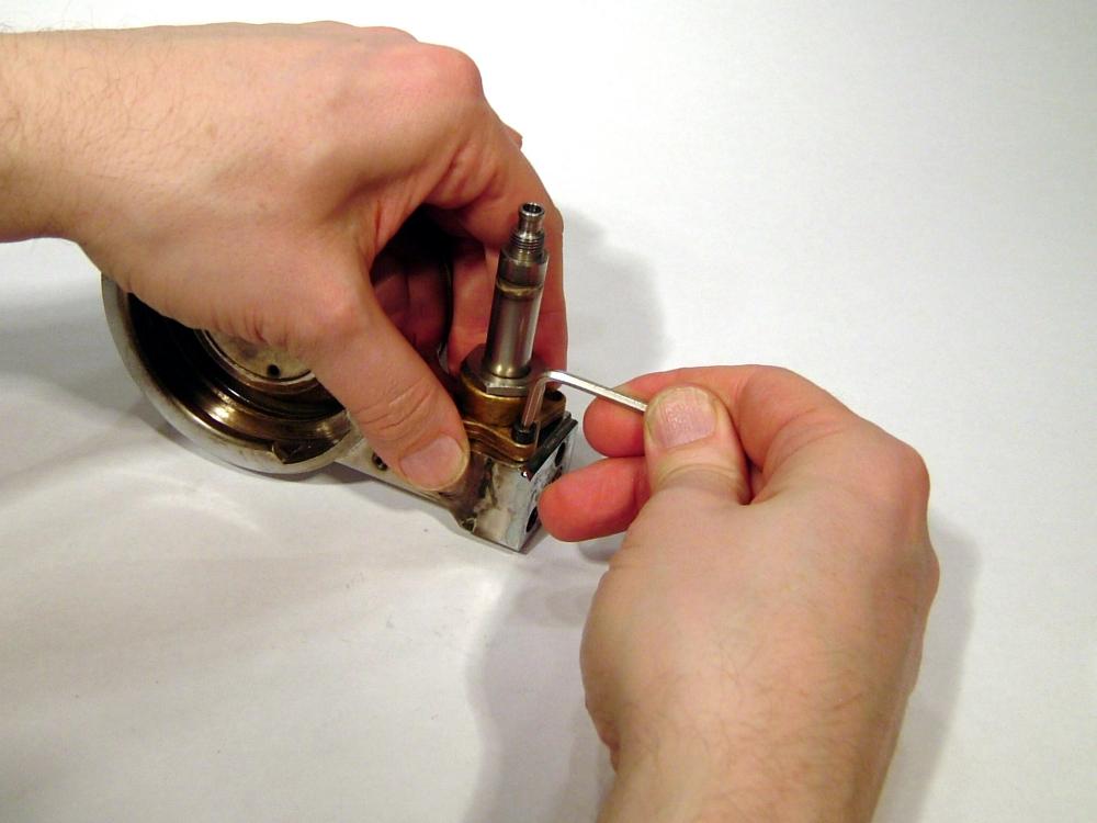 Der 3-mm-Imbus-Schlüssel hat seinen zweiten Auftritt. Ich löse damit die erste von vier Imbus-Schrauben, die den Sockel des Drei-Wege-Ventils fixieren. Je nach Alter der Maschine kann diese Schraube gut festgebacken sein. Von grober Gewaltanwendung rate ich in diesem Fall ab, es ist allemal sinnvoller etwas WD40 (alternativ den Rostlöser Ihres Vertrauens – in meiner Jugend war das Caramba) und eine angemessene Einwirkzeit einzusetzen. Eine abgebrochene Schraube ist extrem ärgerlich an dieser Stelle.
