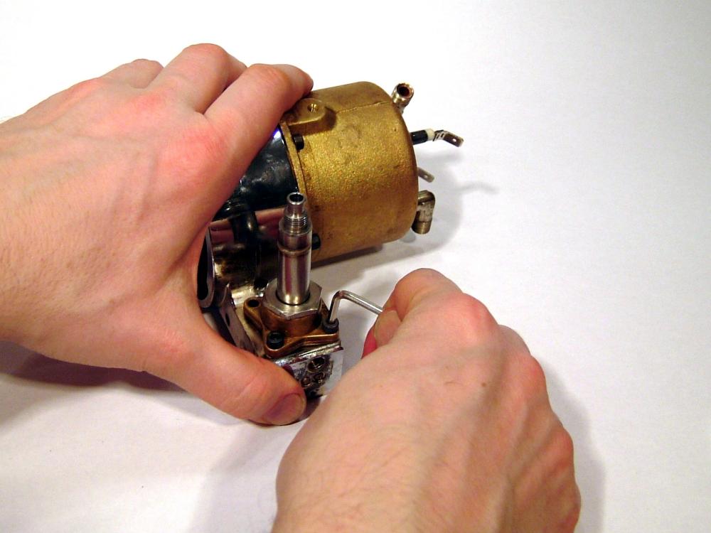 Wie man im Hintergrund etwas unscharf sehen kann, erfolgt die Zuleitung des kochenden Wassers in das Ventil durch eine Bohrung im verchromten