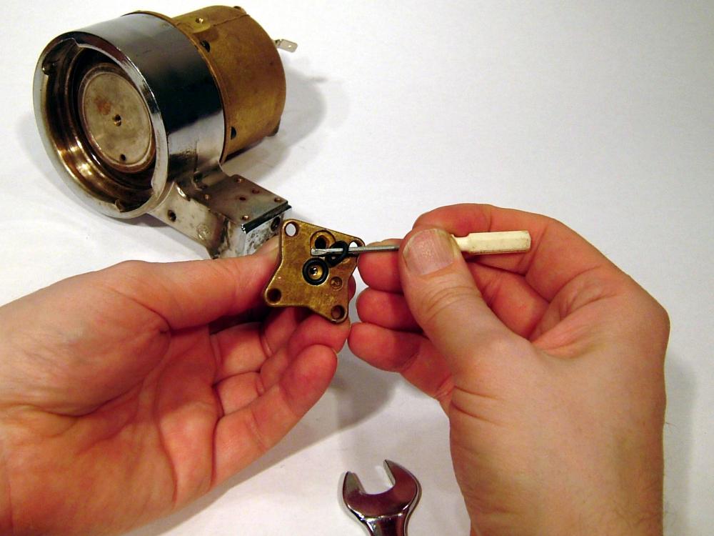 Die vierte Schraube folgt den anderen drei und nun kann man den Ventilkörper abheben. Auch dieses Bauteil kann festsitzen, sollte sich aber mit moderatem Krafteinsatz lösen lassen. Da hier – wie man gleich sehen wird – zwei Gummi-Dichtungen im Spiel sind, empfiehlt sich eher ein Abhebeln (mit dem Ventilkörper selbst als Hebel) als ein seitliches Drücken.
