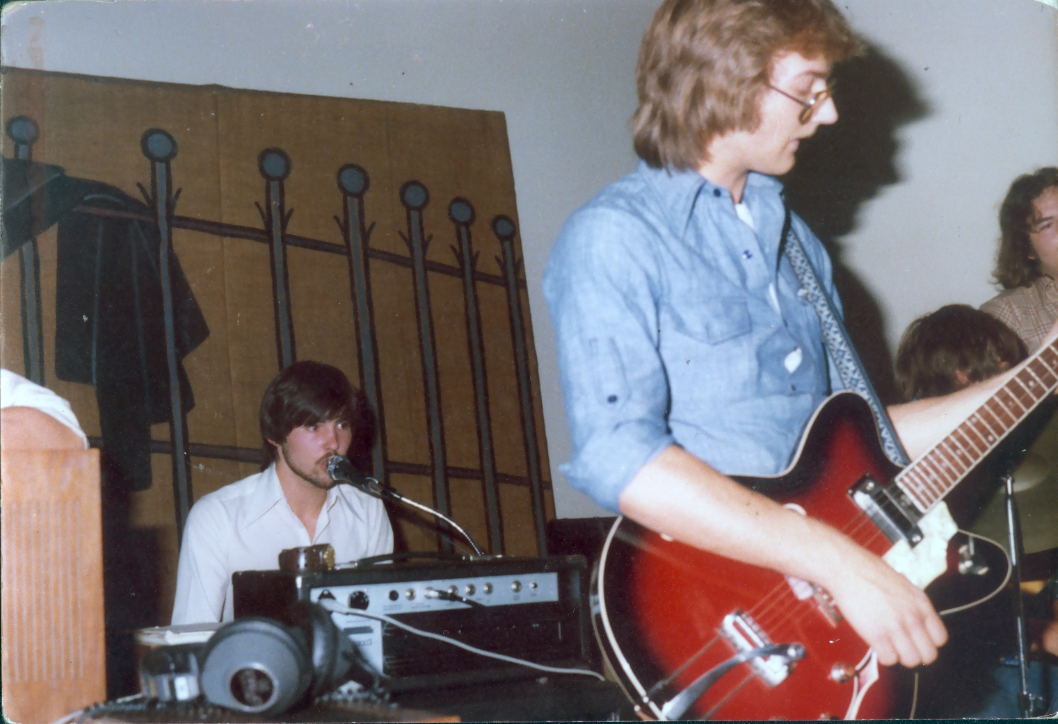Heino Nefen an den Keyboards und beim Gesangseinsatz auf der Abiturfeier unseres Jahrgangs. Im Vordergrund spielt Jürgen Eggloff konzentriert E-Gitarre. Die restlichen Bandmitglieder sieht man auf dem nächsten Bild.