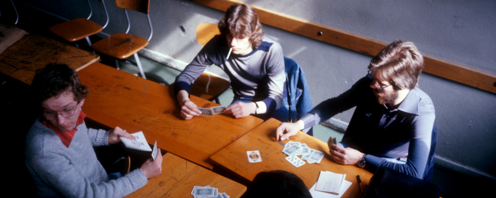 Das große Bild oben zeigt eine Pausenszene im Klassenraum. Wie üblich wird Doppelkopf gespielt. Von links nach rechts: Burkhard Krebber, Joachim Wersch, Michael Heier (nur eine Andeutung des Kopfes am unteren Bildrand) und Frank Lohau.