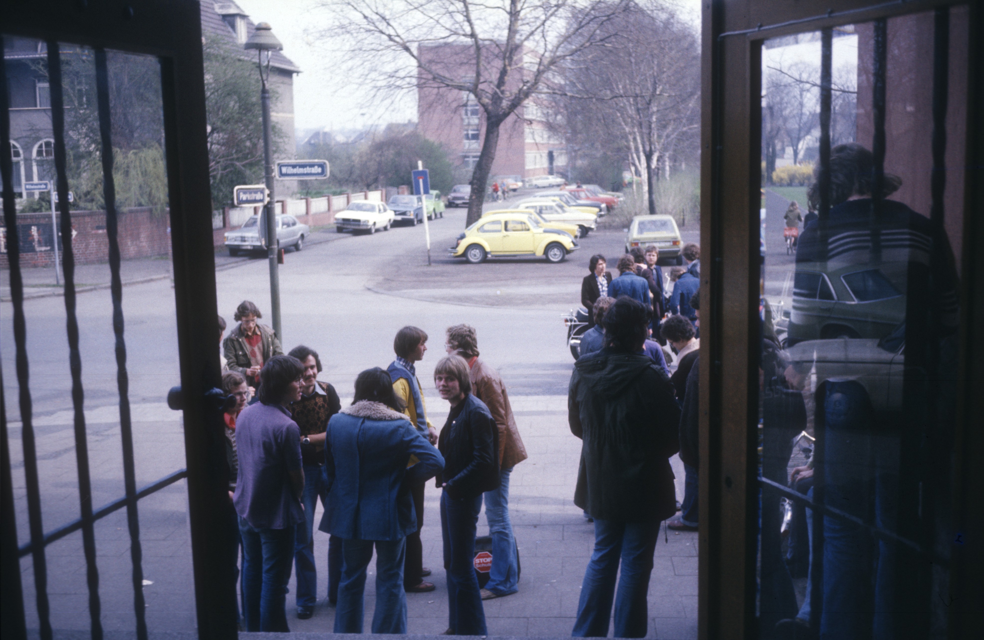 Eine typische Situation vor dem Oberstufen-Eingang. Es gab ja ein klares Zwei-Klassen-System: Die Kleinen mussten den Eingang am anderen Ende des Gebäudes benutzen und durften den Schulhof nicht verlassen (was sie natürlich trotzdem taten - aber das war schon Abenteur.) Dieser Eingang war für die Oberstufe und die Lehrerschaft reserviert.