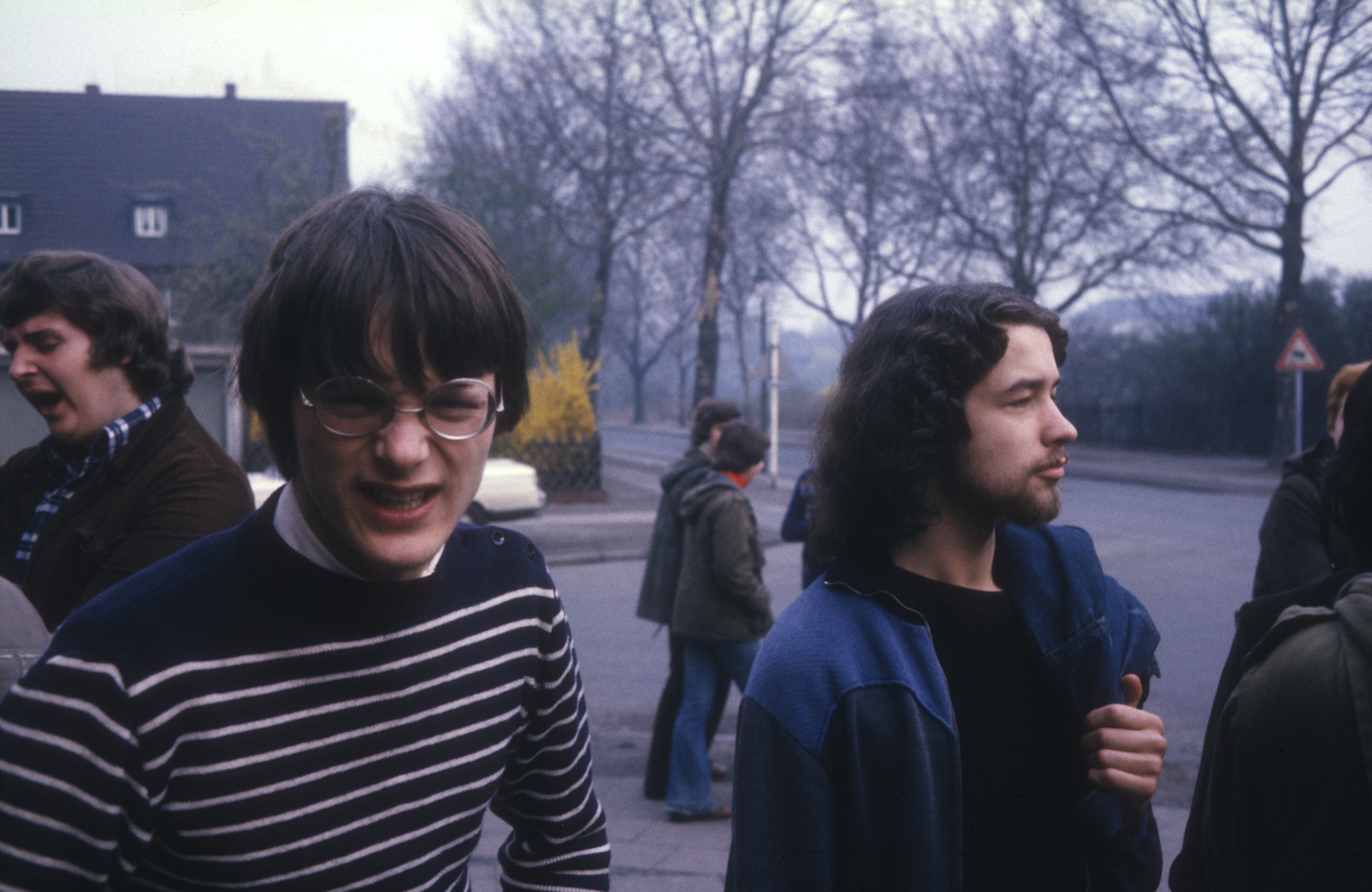 Joachim Anderheide (mit blauen Schulterstücken und Bart) sticht hervor. Links neben ihm Michael Hellweg [?] aus der 12. Klasse. Ganz links wahrscheinlich Michael Baumeister.