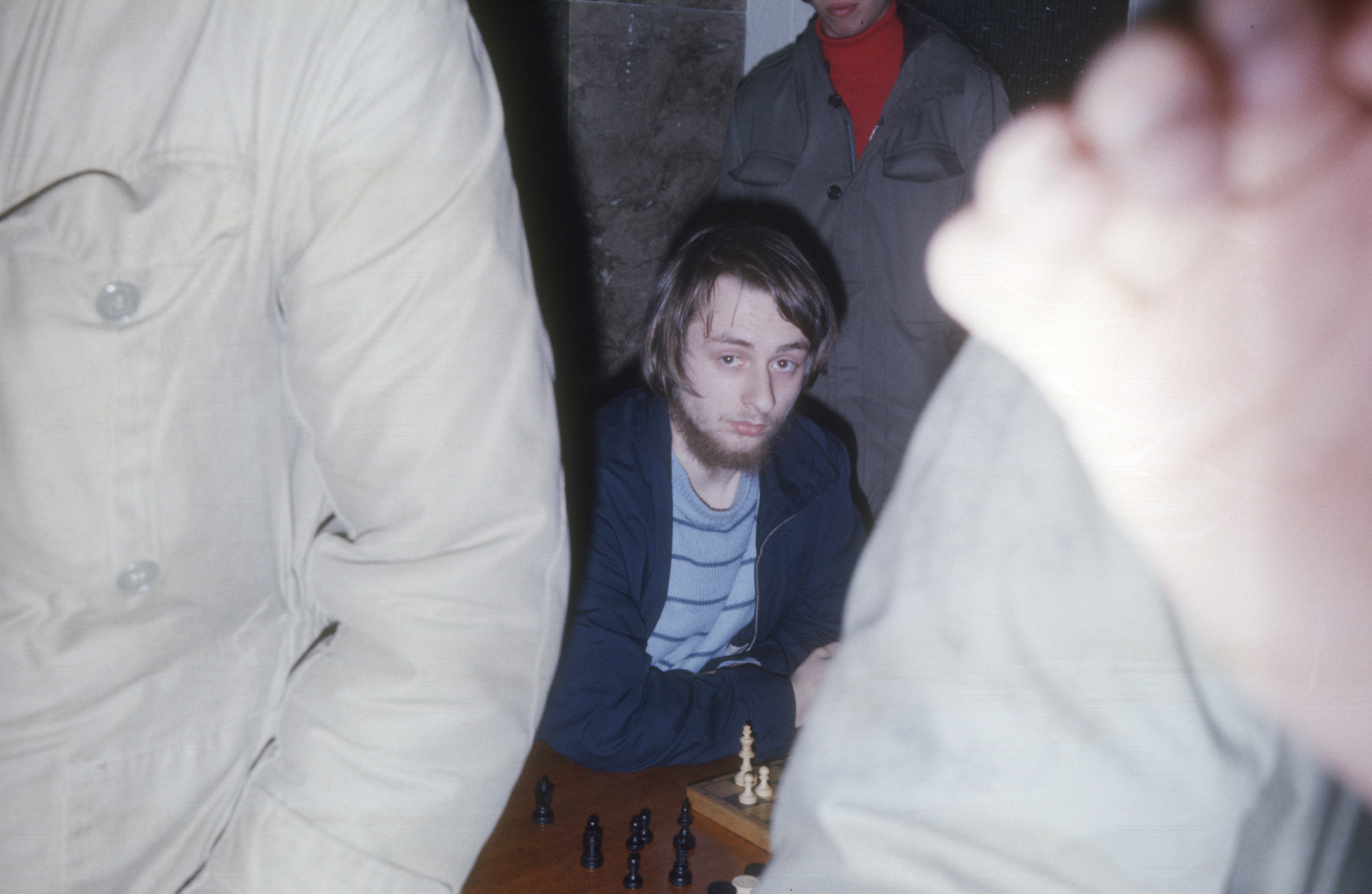 Werner Fabry, der Schachprofi, im Oberstufenpausen-Raum bei der Arbeit. Die einen spielten Doppelkopf, die anderen (eine kleine Minderheit) Schach. Es gab halt noch keine Handys, auf denen man sich sonst seine Zeit hätte vertreiben können.