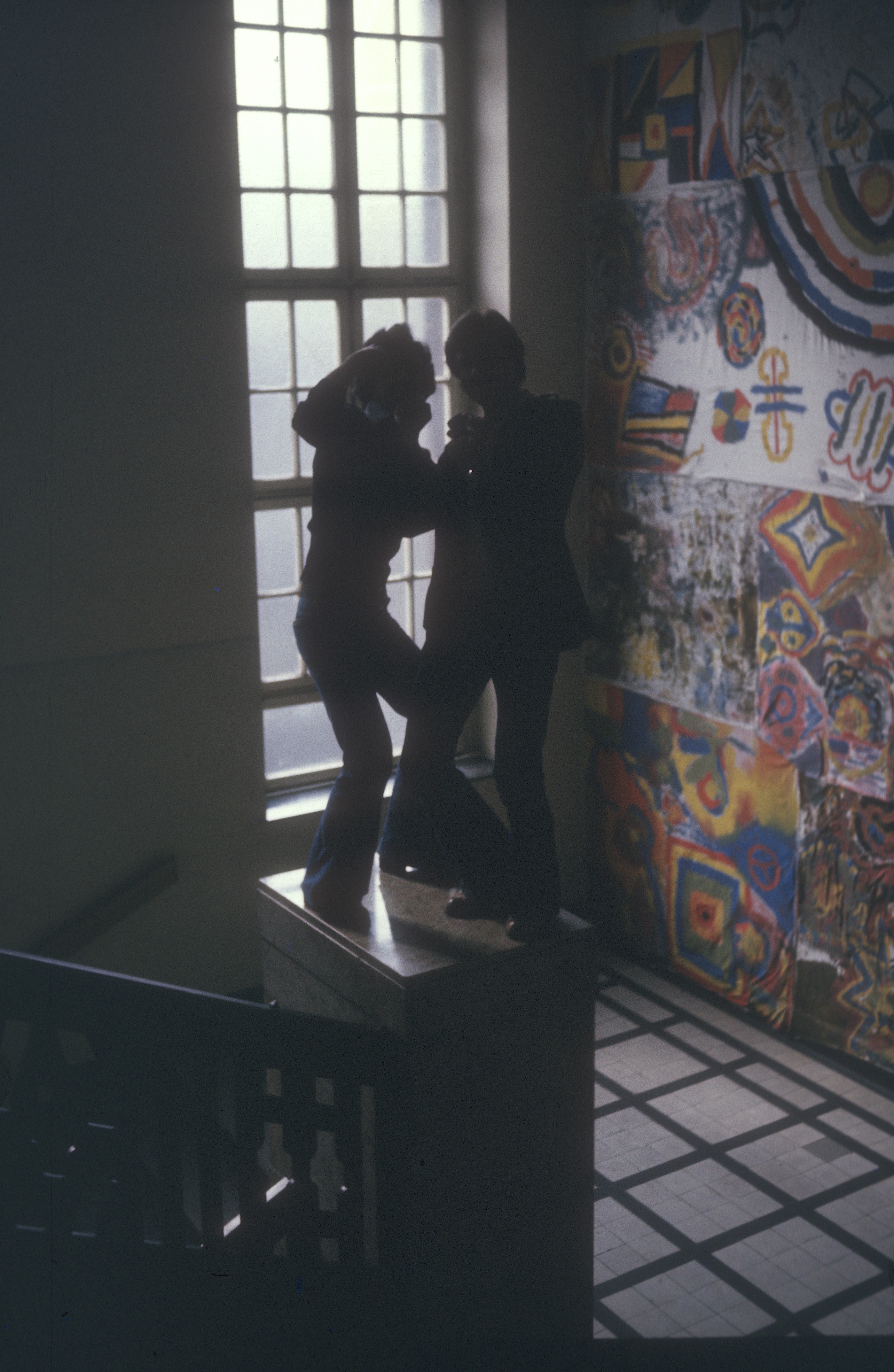 Hier posieren Slavko Jurily und Jürgen Münster im Treppenhaus. Soweit man das bei dieser erbärmlichen Ausleuchtung erkennen kann, orientieren sie sich beiden an „Rocky“, der 1976 ins Kino gekommen war.