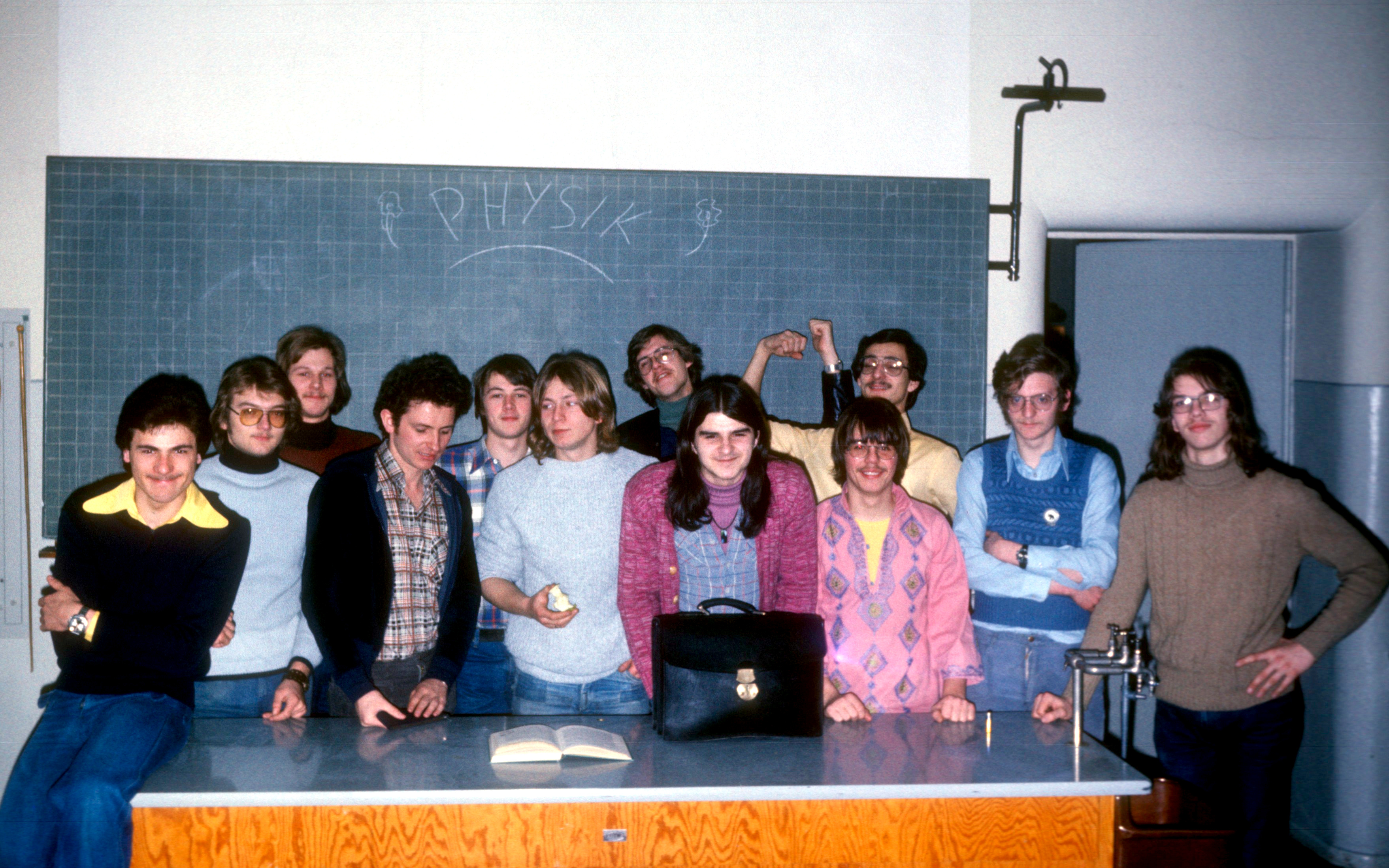 Der Physikkurs bei Herrn Pithan am 3.3.1977. Zu sehen sind von links nach rechts: Jürgen Münster, Jürgen Eggloff, Ulrich Bilitewski, Herr Pithan, Roland Lisson, Klaus Venn, Hans-Dieter Walter, Stephan Vrban, Manfred Neifer, Michael Gutmann, Albert Otto Stelzer und Max Behrendt.