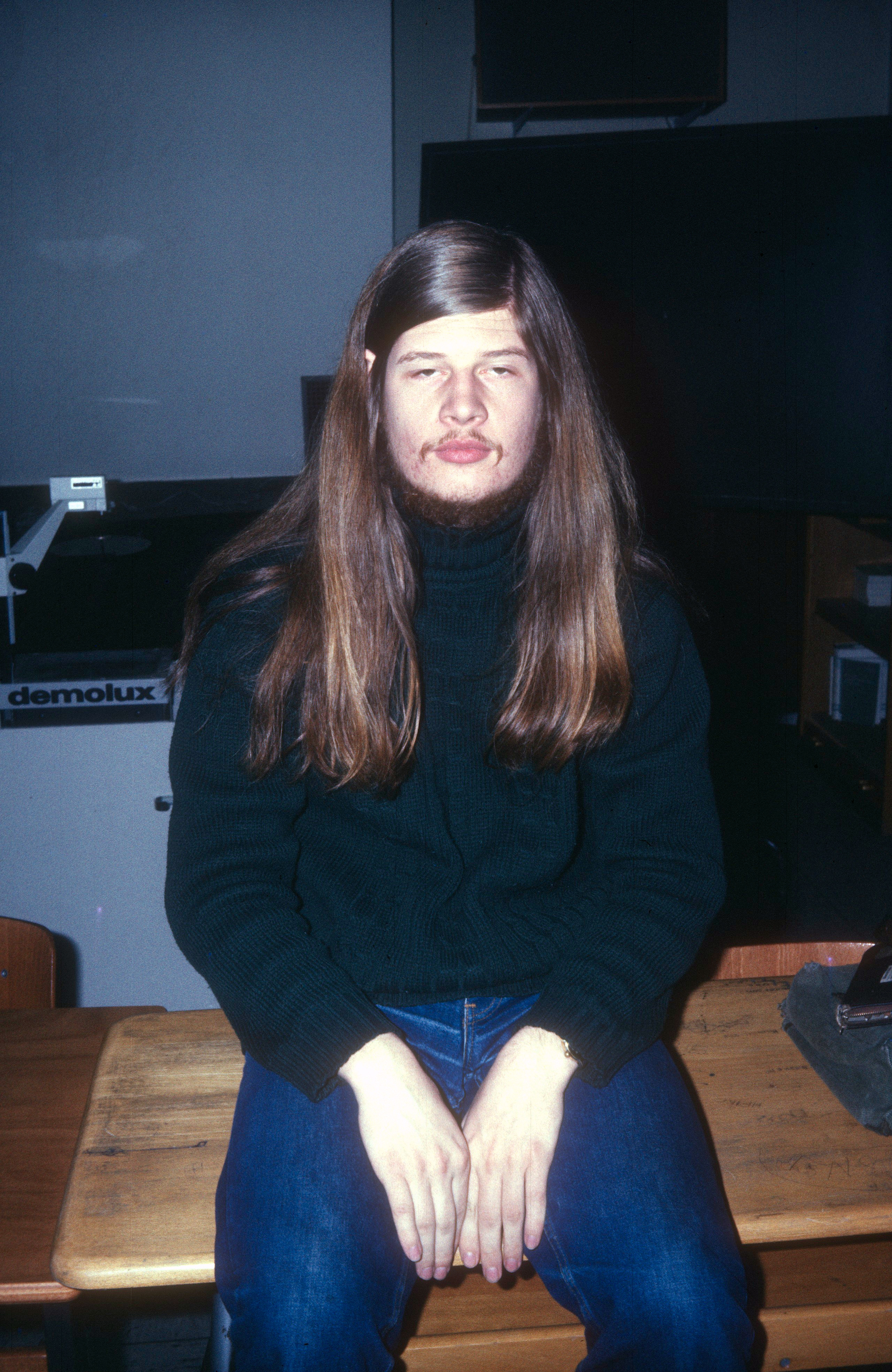 Ein Portrait von Eckhard Dube. Ich gebe zu, dass die Blitzlicht-Beleuchtung nicht unbedingt dazu angetan ist, entspannte Bilder zu erzeugen. Aber zu meiner Verteigung kann ich anführen, dass in der Aula, die ja auch als Unterrichtsraum benutzt wurde, keine guten Lichtverhältnisse herrschten, zumindest nicht für eine Aufnahme mit einem 21-DIN-Diafilm.