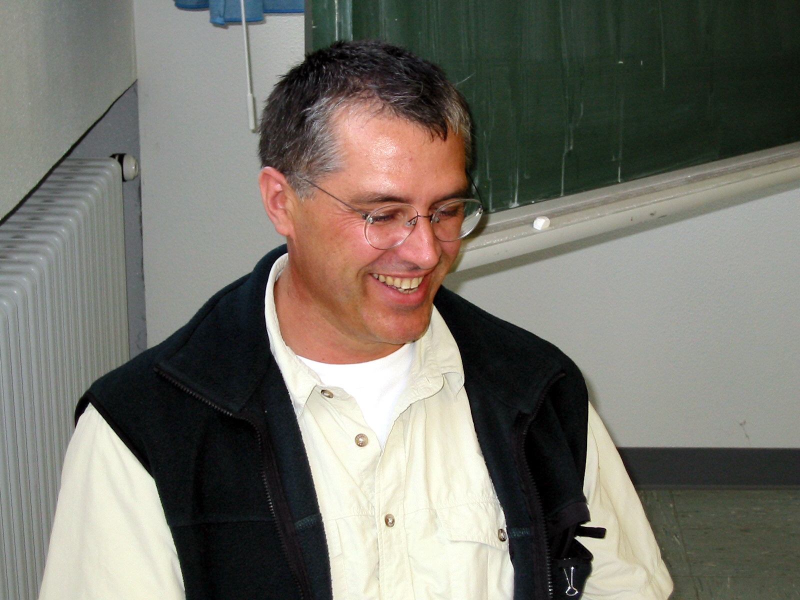 Reinhold Erbing vor einer mittelmäßig gut geputzten Schultafel.