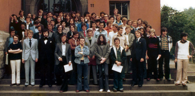 Zum Abitur-Jahrgang 1977 zählen für mich alle, die im Schuljahr 1976/77 die 13. Klasse (Oberprima) des Freiherr-von-Stein-Gymnasiums besucht haben, unabhängig davon ob, wann und wo sie das Abitur letztlich gemacht haben. Das waren 86 männliche junge Erwachsene. Es gibt leider kein Bild, das all diese 86 Mitglieder des Jahrgangs zuammen zeigt. Das obige Bild stammt von der Zeugnisverleihung am letzten offiziellen Schultag, Es sind 68 Personen darauf zu sehen, sie sind alle einzeln anklickbar und mit weiteren Informationen über den Verbleib der Betreffenden verlinkt.