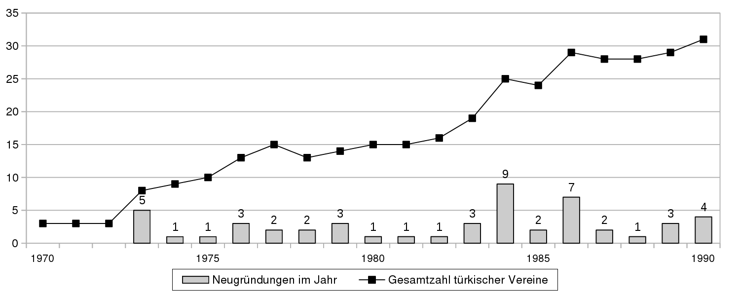 Nach dem „Gründungsfieber“ des Jahres 1984 folgt zunächst eine „Flaute“: 1985 versuchte sich nur der unermüdliche Teoman Atalay mit der Gründung seines „Deutsch-Türkischen Familienclubs“, die rasch im Sande verlief.[31] Doch in den beiden nachfolgenden Jahren waren schon wieder neun Neugründungen zu verzeichnen, von denen allerdings nur fünf bis in die 90er Jahre hinein überdauerten.[32] (Hiervon wird der 1987 gegründete „Ayyıldız Sport-Club e.V.“ als reiner Fußballverein nicht weiter behandelt.)